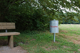 10 beschriftete verzinkte Abfallbehälter neben Sitzbänken entlang des Rubbenbruchsees